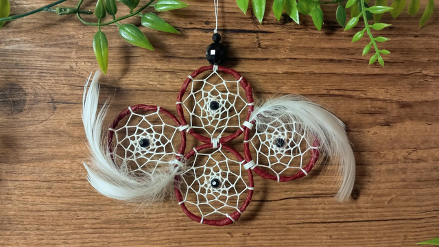 Réalisé avec des lanières de cuir rouges et des plumes d'oie naturelles, cet attrape reve mesure environ 12x16cm