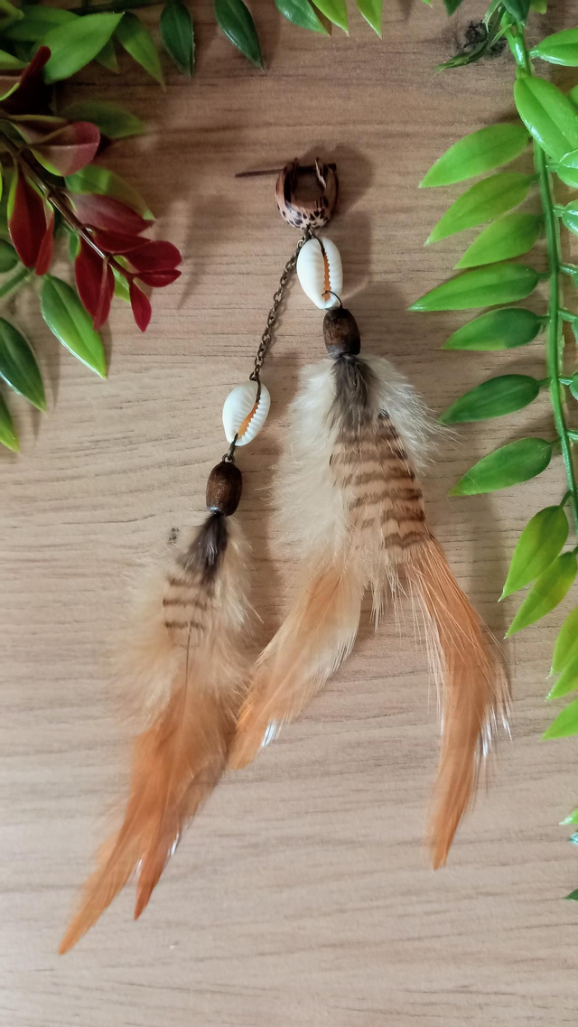 Boucle d'oreilles en bois, plumes de coq naturelles teintées et coquillage cauris