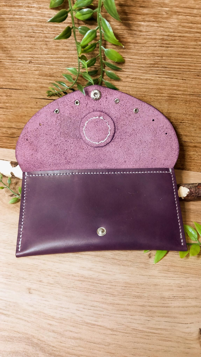 Pochette en cuir de veau lisse avec un cabochon incrusté (ce n'est pas une pierre, mais une jolie petite acrylique nacrée). Il s'agit d'une de mes premières pochettes et de mes débuts en incrustation !